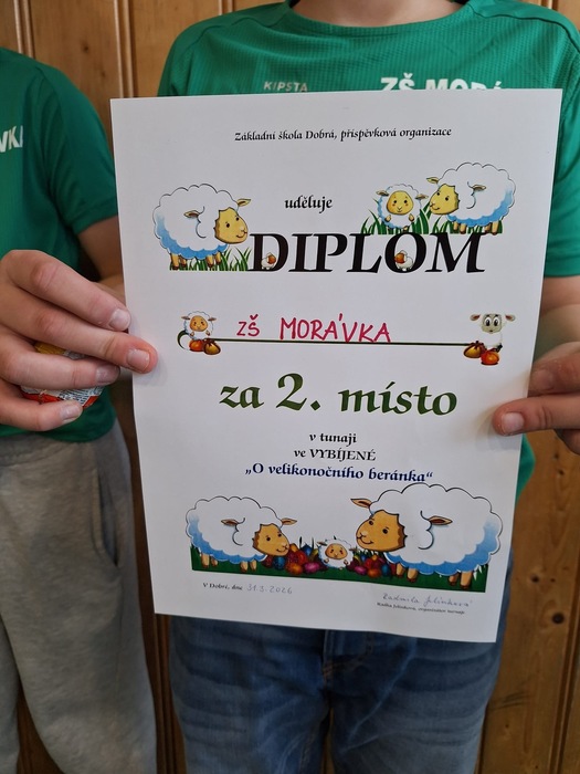 V úterý 31. března se vybraní žáci 4. a 5. ročníku zúčastnili sportovní soutěže ve vybíjené s názvem „O velikonočního beránka“, která se konala v Základní škole Dobrá. V silné konkurenci ostatních týmů předvedli naši žáci výborné sportovní výkony, týmovou spolupráci i velké nasazení. Po napínavých soubojích se jim podařilo vybojovat krásné 2. místo. Všem zúčastněným žákům děkujeme za skvělou reprezentaci školy a srdečně gratulujeme k dosaženému úspěchu!